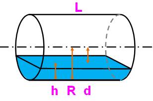 horizontale. Elle contient du gazole. La jauge indique h = ¼ du diamètre du cylindre.