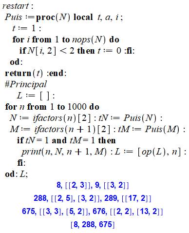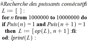 recherche des nombres puissants consécutifs. Boucle de recherche sur n. Pour chacun, test si lui et son successeur son