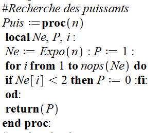 d’un nombre puissant P= 1 si puissant). Ne reçoit les exposants des facteurs de n. P est mis à 1 et sera descendu à 0 si l’un des