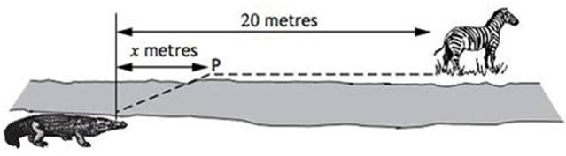 distance x au point P tel que le crocodile minimise son temps pour atteindre