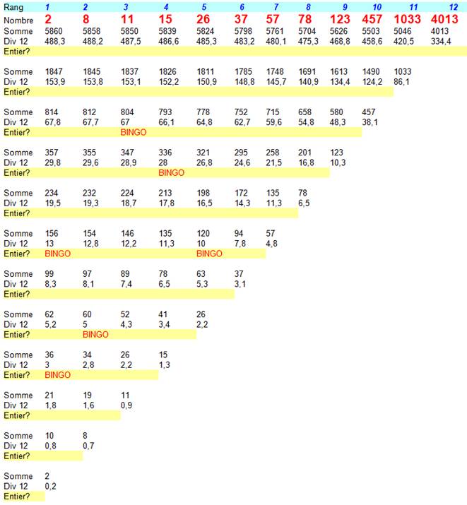divisible par 12 est 804, somme des nombres des rangs 3 à 10. Un deuxième