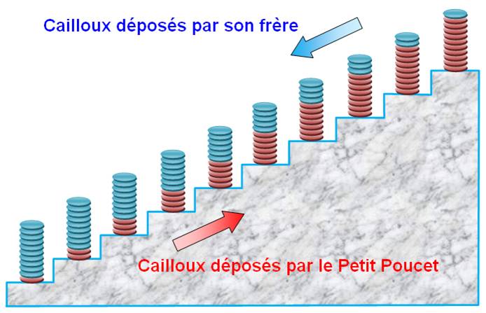 Petit Poucet dépose ses cailloux, son frère part du haut des escaliers et