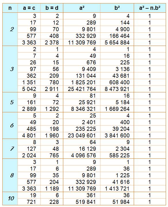 a = c = 97 et b = d = 56 En remarquant que: 97² – 3 x 56² = 9 409 – 3 x 3 136 = 9 409 – 9 408 = 1 |