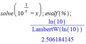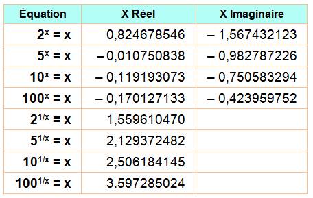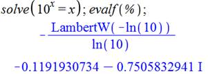Résoudre 10x = x Solution ne peut être qu'un nombre complexe. x = – 0,1191930734… – i