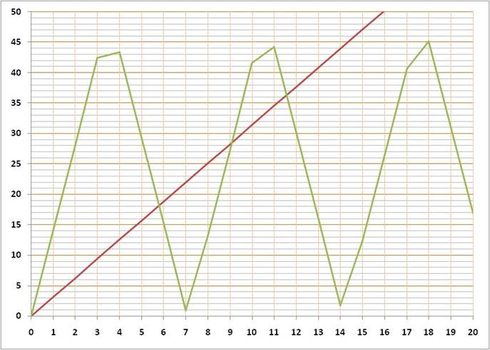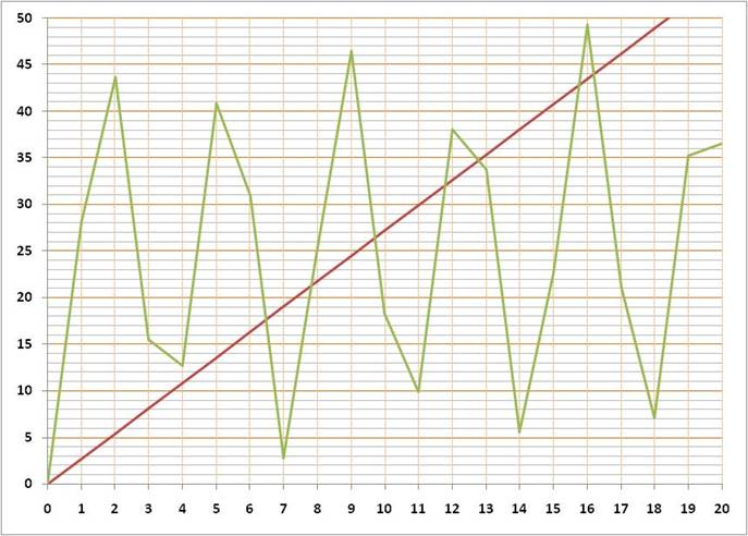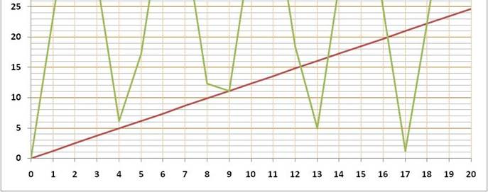 En prolongeant la courbe jusqu'à 100, on trouverait 121/98 = 1,2346 … Évidemment, dans ce cas,