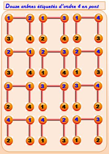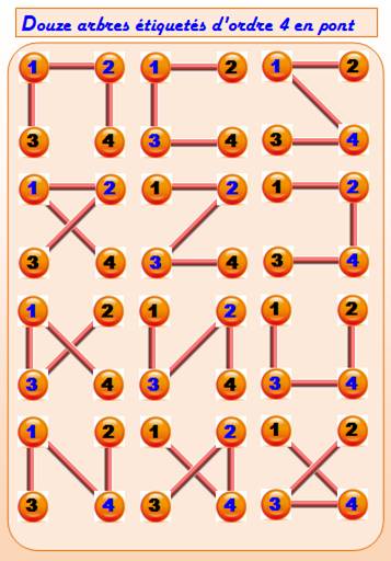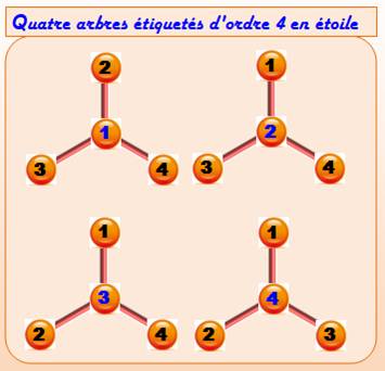 Seul le nœud central définit un arbre étiqueté. Soit quatre cas. Bilan 12 arbres n pont et 4 arbres en étoile, soit 16 arbres étiquetés d'ordre 4 Cayley remarqua que, Q4 = 16 = 44 – 2 |