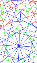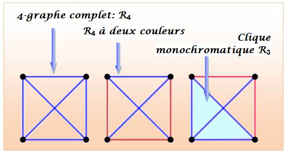 soit un triangle (R3) rouge ou triangle (R3) bleu. Ce nombre R(3, 3) est appelé nombre de Ramsey. |