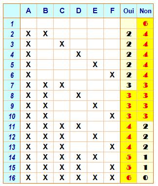 connaissent pas. On dit que le nombre de Ramsey est 6 pour ce cas {3, 3}. On note R(3, 3) = 6. Tableau Six personnes A, B, C, D, E et F. Seize cas de connaissances symbolisés par les croix dans les colonnes Les deux dernières colonnes comptabilisent la quantité de connaissances