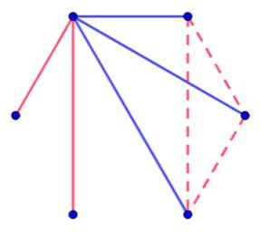 on trouve inévitablement un triangle monochrome Le nombre de Ramsey (3, 3), supérieur à 5, est donc 6. En fait, il a été prouvé qu'il existe toujours deux triangles monochromatiques. |