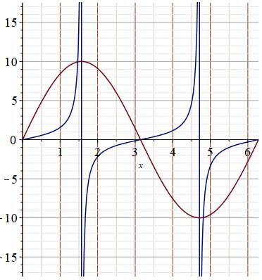de s'enfuir vers l'infini pour Pi/2 et 3Pi/2. Idem pour cotangente avec exception en k.Pi |