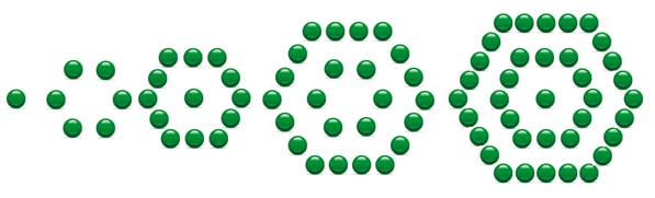 Sommaire de cette page >>> Nombres hexagonaux concentriques >>> Nombres heptagonaux concentriques |