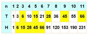 nombres successifs. Départ avec les hexagonaux(H), puis, dans la succession des nombres, le premier du second membre est