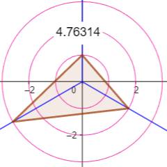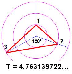 Construction Trois cercles concentriques de rayon 1, 2 et 3. Trois rayons à 120° les uns des autres. On trace le triangle avec pour sommet les points