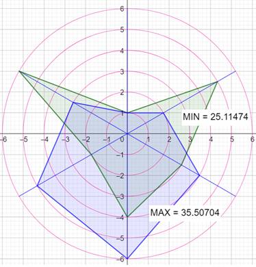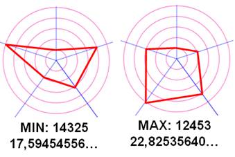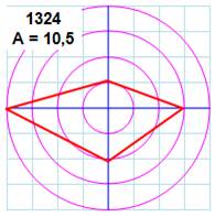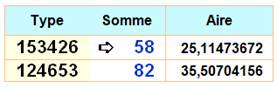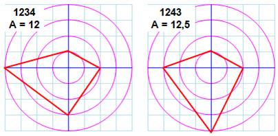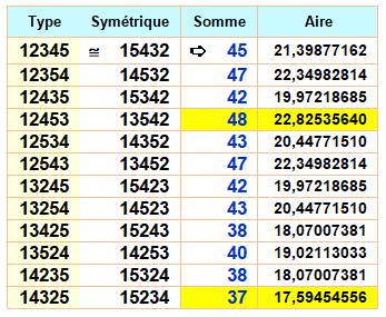 produits des sommets pris par couples successifs. Aire minimale: 10,5 avec 1324 Aire maximale: 12,5 avec 1243 |