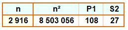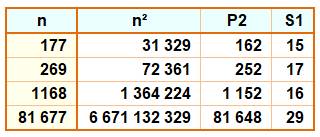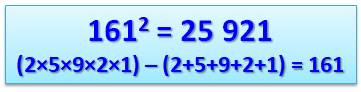 des chiffres de n. Exemple 177² = 31 329 177 = (3x1x3x2x9) + (1+7+7) = 162 + 15 |