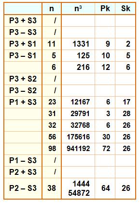 Peu de succès avec le cube de n. Le tableau montre les dix cas possibles. Exemples 113 = 1 331 11 = (1x3x3x1) + (1+1) = 9 + 2 233 = 12 167 23 = (2x3) + (1+2+1+6+7) = 6 + 17 38² = 1 444 383 = 54 872 38 = (1x4x4x4) + (5+4+8+7+2) = 64 – 26 |