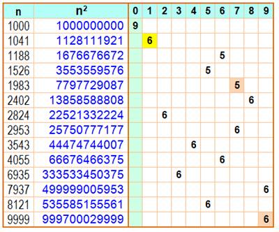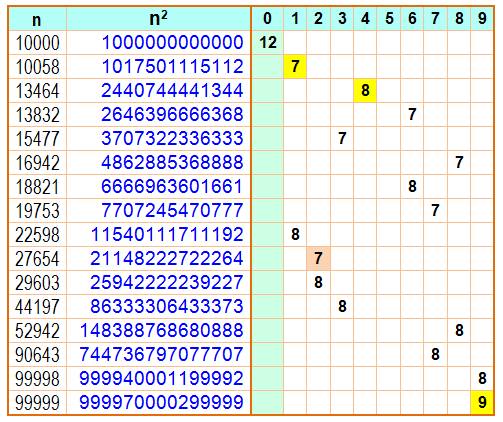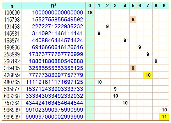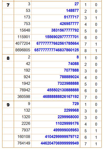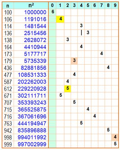 Exemple de lecture: 73 = 343 qui est le premier cube qui comporte deux fois le