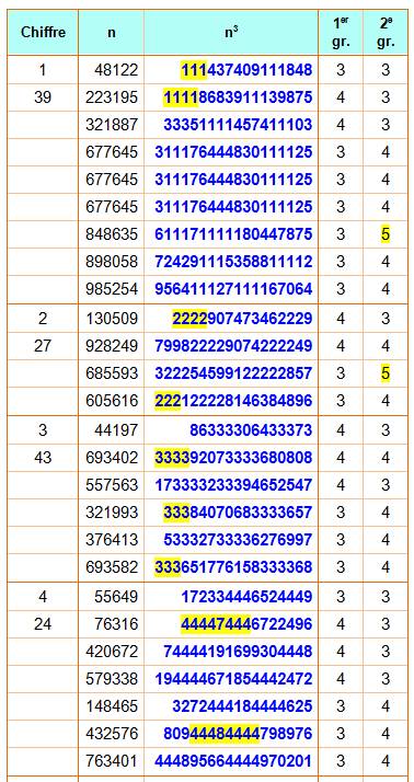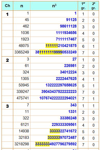sont les cubes des nombres qui comportent le plus de 1 à la suite, ou de 2, etc. Idem