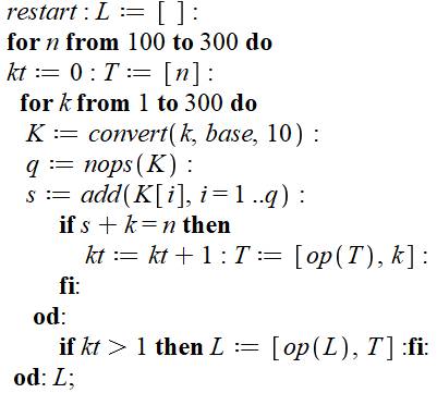 Commentaires Réinitialisation générale. Définition d'une liste L pour y loger les nombres jonctions. Boucle d'analyse de nombres n de 100 à 300. Préparation