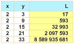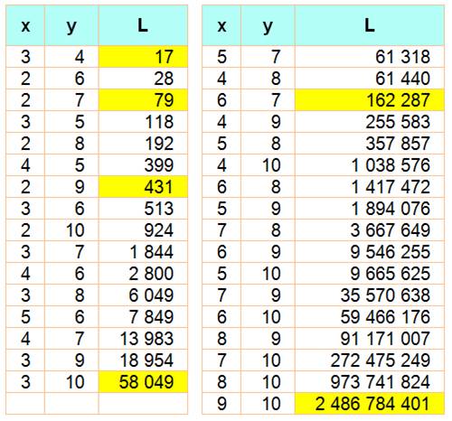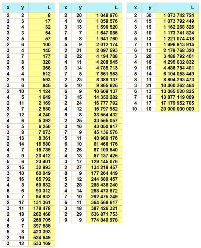 croissantes jusqu'à 20 000 000 000 (93 valeurs) L = xy