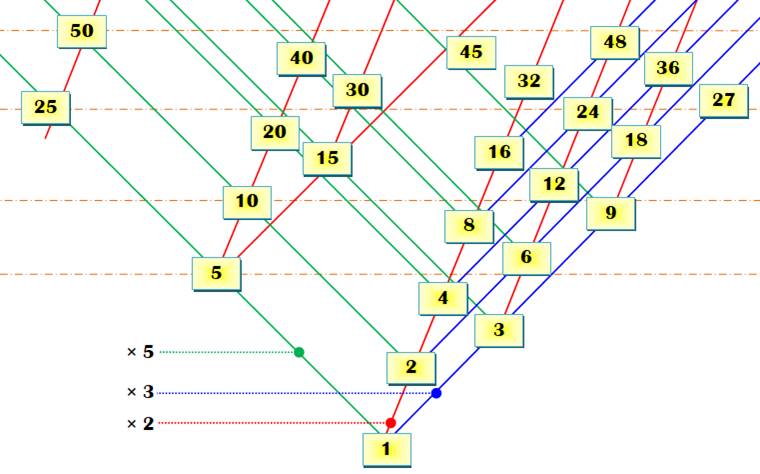 Diagramme de Hasse des nombres réguliers jusqu'à 50: tous les multiples