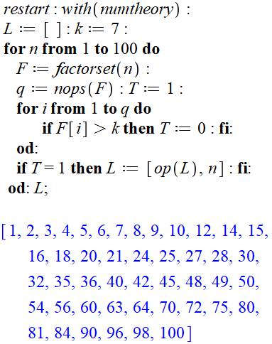 nombres k-friables. Ici k = 7. Boucle d'analyse des entiers n. Recherche des facteurs premiers en F, leur