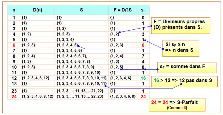 des nombres S-parfaits pour n de 1 à 24