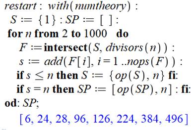 la liste SP des nombres S-Parfaits. Boucle d'analyse des nombres de 2 à 1000. Formation de l'ensemble F des diviseurs commun à