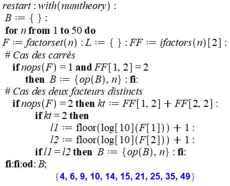 Sommaire de cette page >>> Nombres brillants >>> Liste de nombres brillants >>> Programmation – Maple |