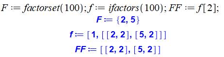 for n to 50 do F := factorset(n); L := {}; FF := ifactors(n)[2]; if nops(F) =