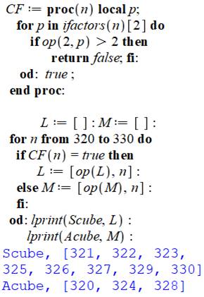programme produit la liste des nombres sans cube et celle des nombres avec