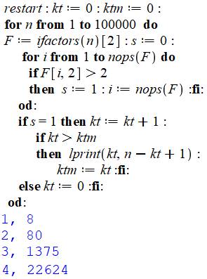 ci-dessus. Exemple: 80 = 24 x 5; 81 = 34 OEIS – A271443 – Earliest start of a run