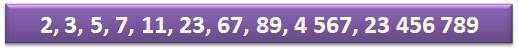 2, 3, 5, 7, 11, 23, 67, 89, 4567, 23456789 |