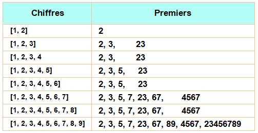 [chiffres], {premiers} [2, 3, 5, 7, 1, 1], {2, 3, 5, 7, 11, 23, 71,