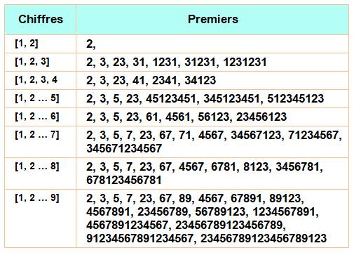 Table des nombres premiers résultant de la concaténation des