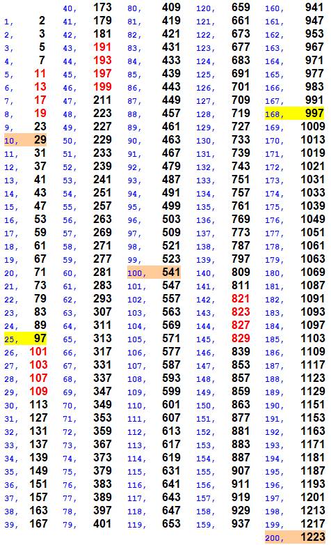 881 60, 1949 85, 3251 11, 137 36, 1019 61, 1997 86, 3257 12, 149 37, 1031 62, 2027 87, 3299 13, 179 38, 1049 63, 2081 88, 3329 14, 191 39, 1061 64, 2087 89, 3359 15, 197 40, 1091 65, 2111 90, 3371 16, 227 41, 1151 66, 2129 91, 3389 17, 239 42, 1229 67, 2141 92, 3461 18, 269 43, 1277 68, 2237 93, 3467 19, 281 44, 1289 69, 2267 94, 3527 20, 311 45, 1301 70, 2309 95, 3539 21, 347 46, 1319 71, 2339 96, 3557 22, 419 47, 1427 72, 2381 97, 3581 23, 431 48, 1451 73, 2549 98, 3671 24, 461 49, 1481 74, 2591 99, 3767 25, 521 50, 1487 75, 2657 100, 3821 |