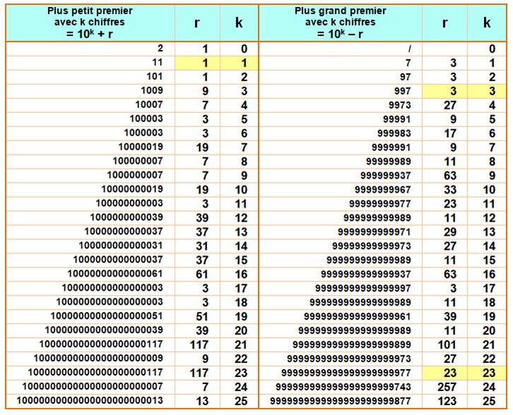 jaune égalité k = r telle que par exemple: 1023 – 23 est premier