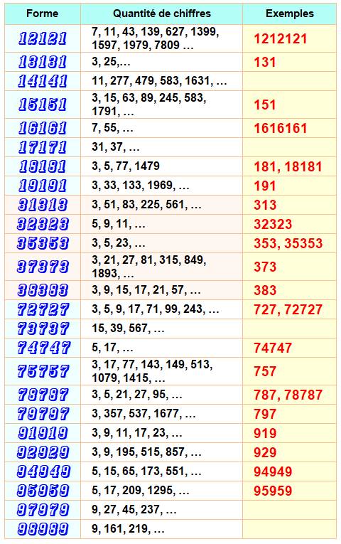 pour les nombres premiers ondulants à trois et cinq chiffres 101, 131, 151, 181, 191,