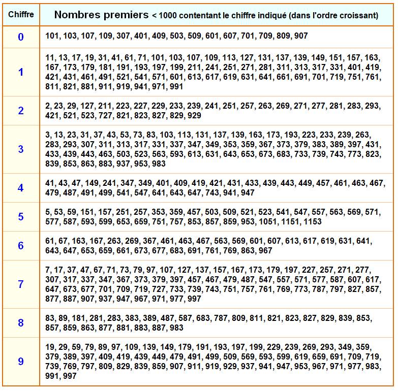 Nombres premiers contentant un chiffre donné |