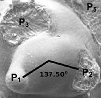une après les autres – les primordia – espacées d'un angle d'environ 137,5°. |