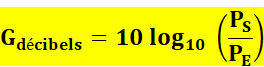 G = 10 log10 (PS / PE) Exemple Si le rapport des puissances est de 1 million (106) Le gain est G = 10 log10 (106) = 10 x 6 = 60 dB