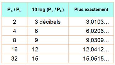 définition du décibel C'est le logarithme du rapport entre deux puissances: