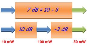 Un ampli de 7dB = ampli de 10 dB puis ampli de -3 dB. |