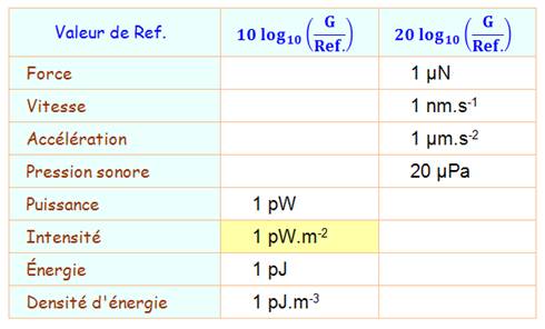 log ou 20 log selon la grandeur (G) et indication de la grandeur de référence
