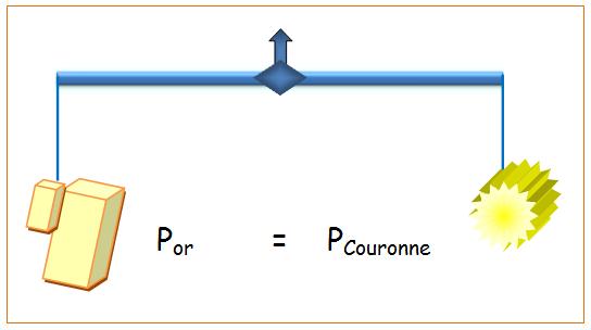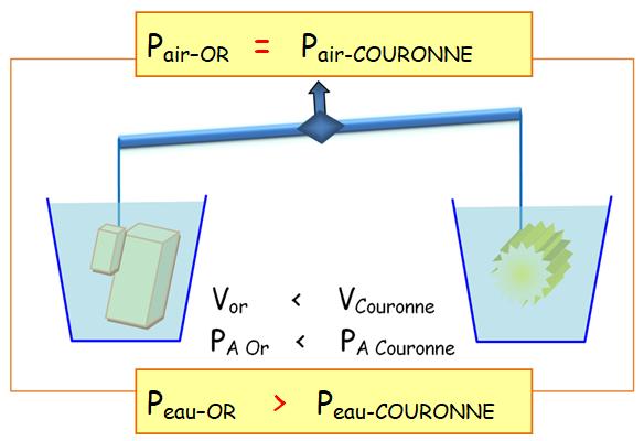 doit trouver si la couronne en or est frelatée et cela sans la corrompre. Les deux versions de l'expérience:
