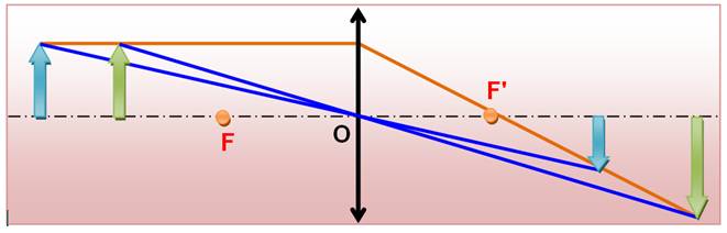 (rayons marron et bleu parallèles). En dépassant ce point, l'image revient par