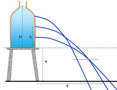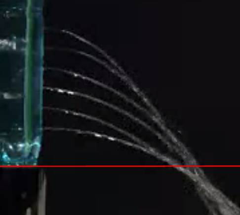Trajectoires paraboliques à la sortie des trous dans la bouteille. Le trait rouge matérialise la base de la bouteille. Source