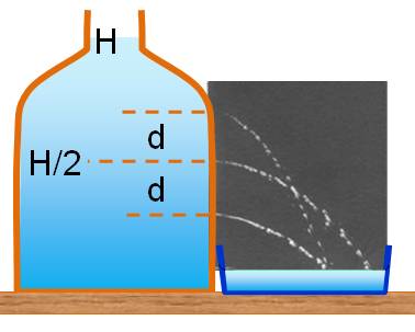 H est la hauteur totale du liquide; h est la hauteur où se trouve la perforation; g l'accélération